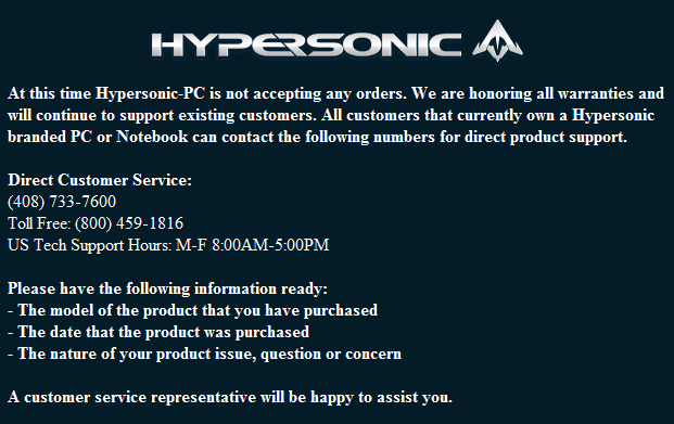 The company’s web site says, At this time Hypersonic-PC is not accepting any orders. We are honoring all warranties and will continue to support existing customers.†They give a contact number for future support needs. The company was bought out by OCZ in 2007 and would release cutting edge technology via the division.